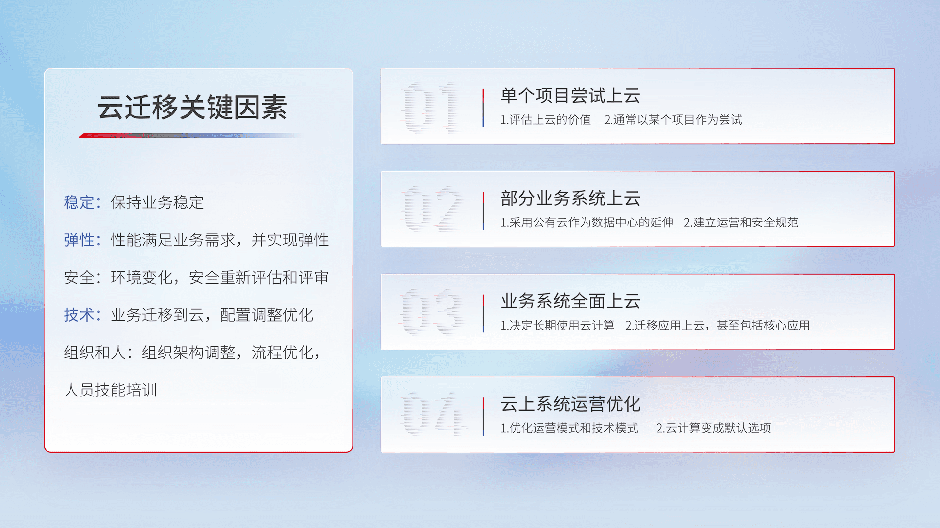 结合实际业务,,,从规划设计、、、云平台选型、、、云原生改造、、数据迁移、、集成交付,,迁移全过程为客户识别最佳上云路径,,,做好风险识别管理,,设计网络架构、、、身份权限、、、、安全审计合规、、、操作审计、、、日志审计、、、监控告警策略、、、多站点容灾设计等,,,,对云上基础设施进行整体规划,,,,提升IT治理水平,,以满足弹性、、高可用、、、、高性能的需求。。
