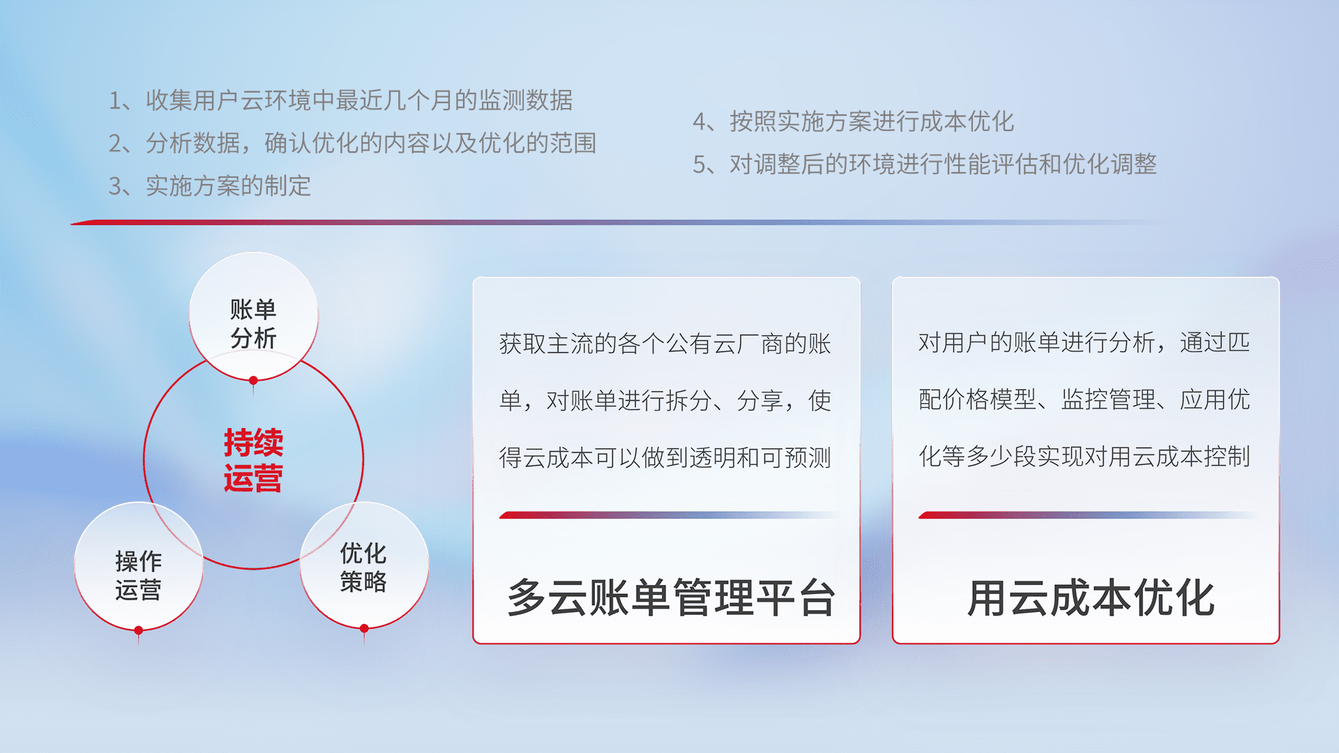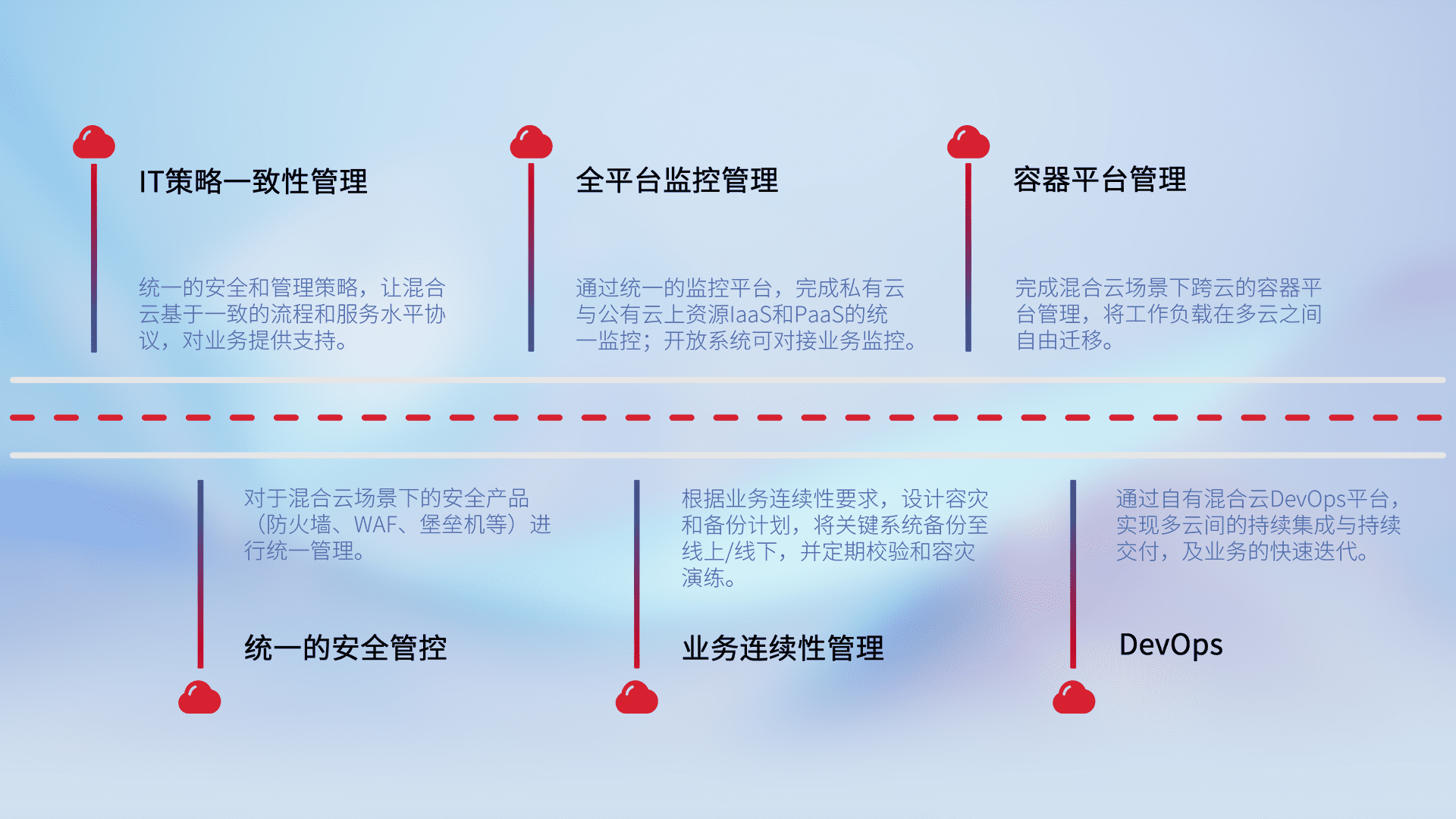 通过多云纳管,,,以统一的资源数据模型把客户的云资源进行抽象和封装,,,,进而实现对多云资源的统一操作,,,,保障云资源管理的可靠性、、、、稳定性与可用性。。。。量身定制化运维内容,,,,配置、、、开发运维、、补丁管理、、、备份、、监控、、认证和访问管理、、、、审计和日常巡检等,,保障在用云过程中的可靠度,,,稳定度以及高可用率。。