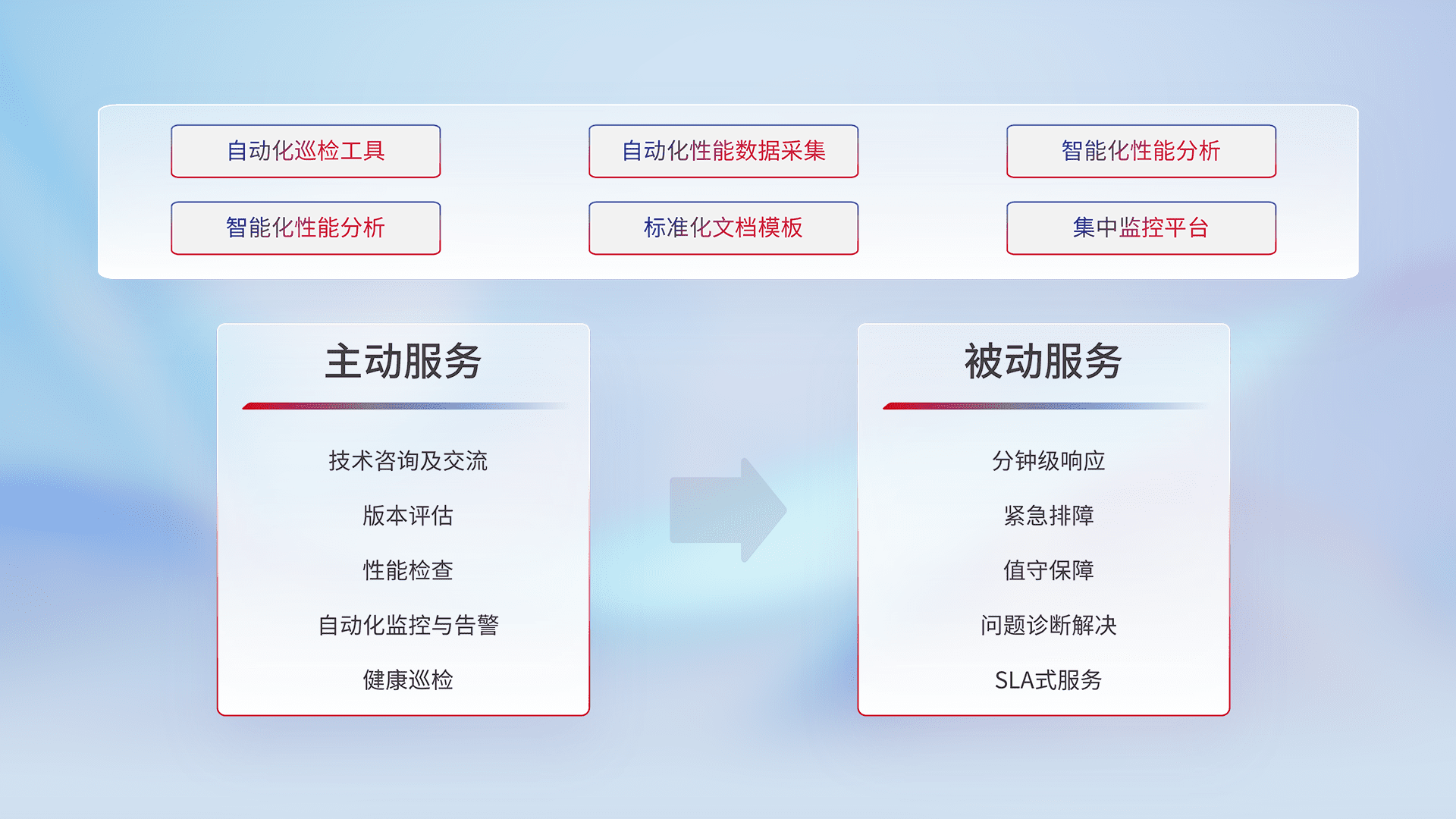 智能化工具和标准化文档,,,,保障服务质量,,提供主动服务(包含技术咨询、、、、版本评估、、、性能检查、、、自动化监控与告警、、、、健康巡检)和被动服务包含(分钟级响应、、、、紧急排障、、值守保障、、、问题诊断解决、、、SLA服务)。。。。